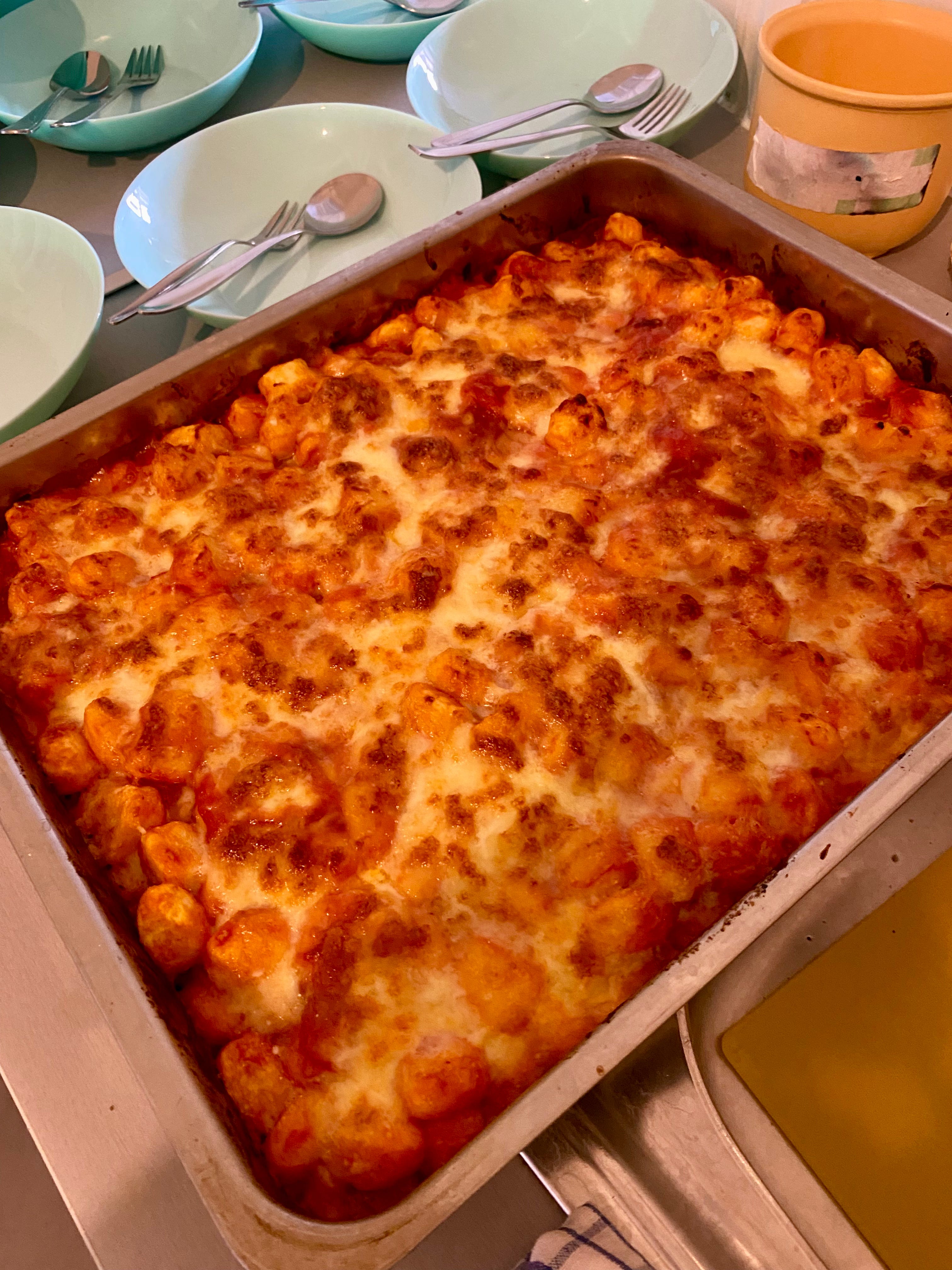 Den Mozzarella in Stücke reißen und gleichmäßig über den Gnocchi verteilen. Einige Stücke etwas tiefer hineindrücken. Den grob geriebenen Parmesan darüber verteilen und im Rohr backen, bis der Käse blubbert und die Oberfläche schön gebräunt ist, etwa 30 Minuten.